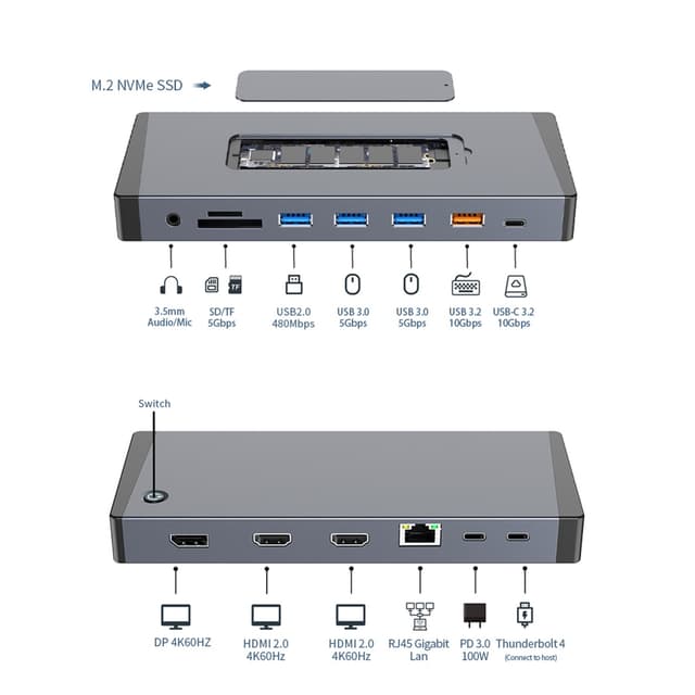 - NÖRDIC USB-C 1 till 15 Dockningsstation Thunderbolt 4 Trippla skärmar, 2xHDMI, 1xDP, 1xUSB-C PD 100W, 1xUSB-C, 4xUSB-A, med M.2 NVMe SSD-platsSäljs av:Nördic AB1200.-960.-exkl. momsSäljs online| Finns ej i butik992931