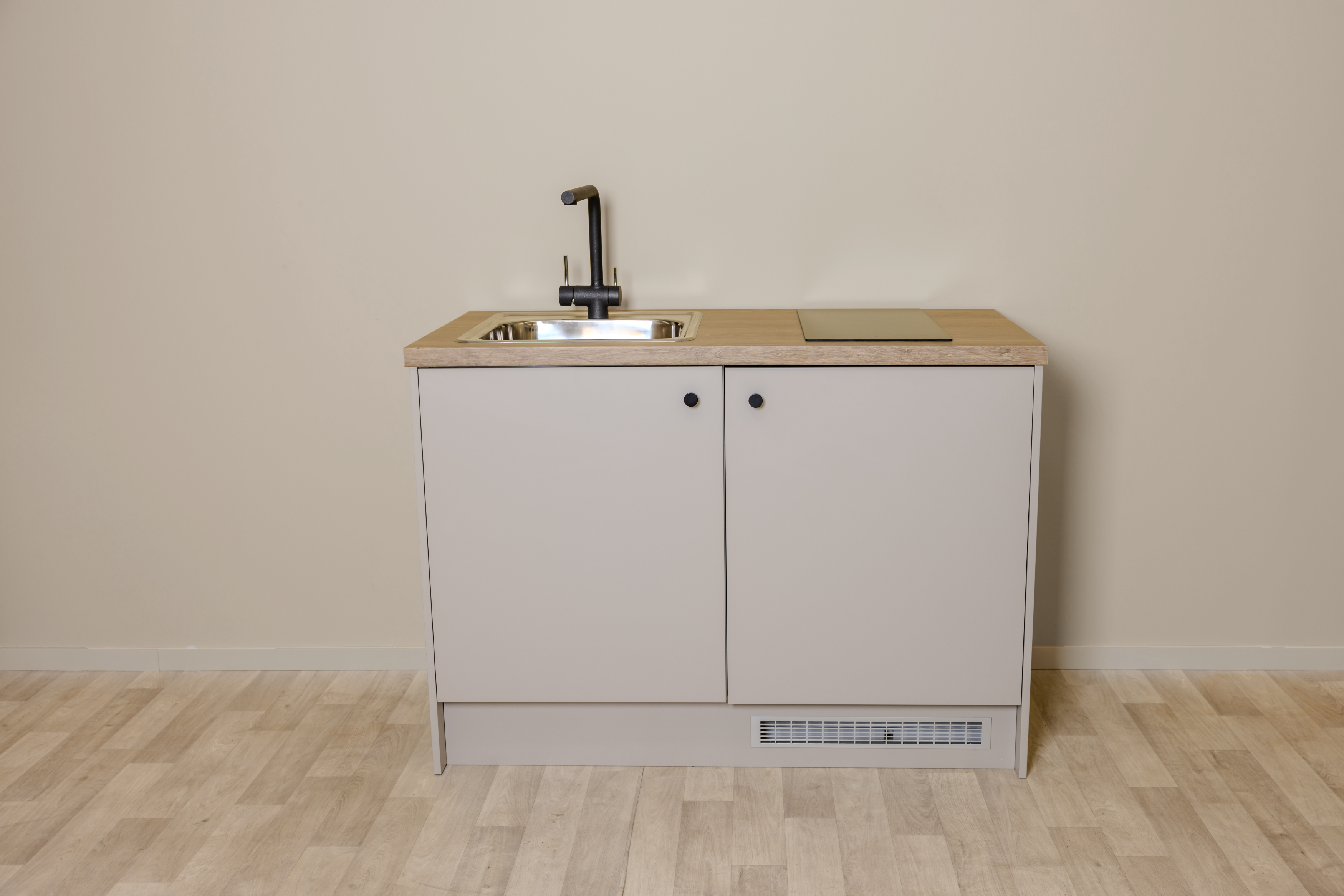 Hos Epoq kan du utan kostnad eller förpliktelse få ditt kök ritat av en köksspecialist. Om du ändå vill ha en snabb och enkel lösning för ditt kontor eller lägenhet så erbjuder vi detta praktiska minikök. Den innehåller en 60 cm modul för diskbänk och en dörrfront för ett integrerat kylskåp. Du kan också installera en liten spishäll ovanför kylen. Bänkskivan är en bänkskiva med fast längd i laminat som kan skäras till önskad längd. Se manualen för montering av bänkskivor med fast längd. Om du är intresserad av att köpa detta Epoq minikök, boka då ett gratis konsultationsmöte i din Elgiganten-butik.