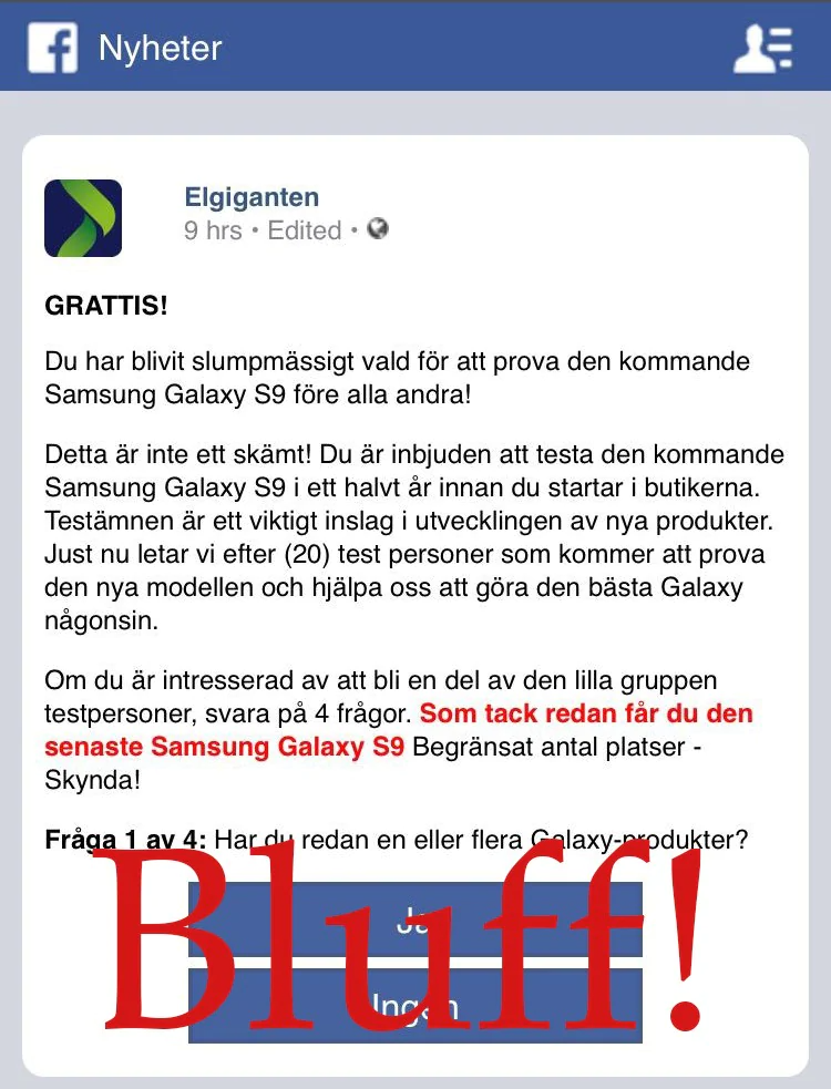 - Har du fått ett personligt mejl eller sms som påstår att du vunnit en tävling eller en utlottning? Det är en bluff! Elgiganten genomför inga tävlingar eller utlottningar.