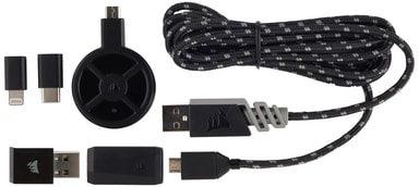 Använd antingen en USB-kabel för trådbunden laddning eller en Qi-kompatibel laddningsplatta som Corsair MM1000 för trådlös laddning.