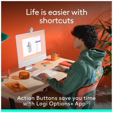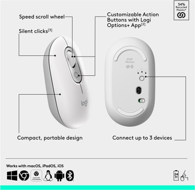Logitech POP mus passar både vänster- och högerhänta användare och har en enkel Bluetooth-anslutning tillsammans med en 2-års batteritid på endast ett enda AA-batteri. Den optiska sensorn på 4000 DPI säkerställer precision medan SmartWheel och anslutning till flera enheter ger dig hög flexibilitet.