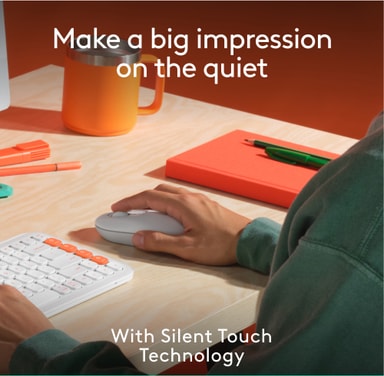 Tysta Logitech POP mus har en optisk sensor på 4000 DPI samt SmartWheel, FLOW-anslutning för flera enheter,enkel Bluetooth-koppling och en batteritid på upp till 2 år.Läs mer om produkten