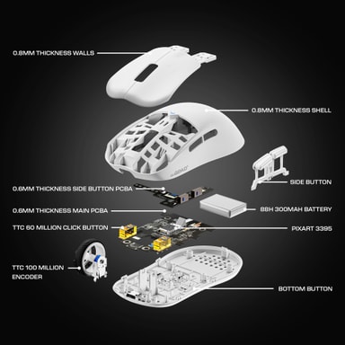 PAW 3395 optiska sensorn stödjer en hög DPI på upp till 26 000, vilket möjliggör exakt kontroll och anpassningsförmåga till olika spelsituationer. Denna sensor säkerställer en 4K-pollningsfrekvens för hög respons, låg latens och exakta musrörelser, vilket ger en konkurrensfördel i snabba spel.
