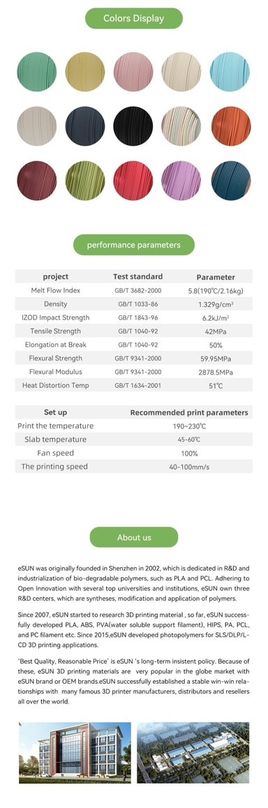 ePLA fra eSUN med en matt finish på overflaten. Den er sterkere enn vanlig PLA med bedre lagbinding. Printes som vanlig PLA, og gir enkelt gode resultater. Filamentet gir jevne og fine overflater, liten mulighet for krymping og lite stringing.