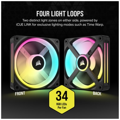Din fläkt kan hjälpa dig att skapa den ultimata ljuskompositionen med 34 RGB-lysdioder som enkelt kan styras av Corsair iCUE-programvaran som synkroniserar belysningen för alla dina iCUE-enheter.