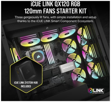 • Corsair iCUE LINK QX120 RGB 120 mm PWM fläktstartsats (3-pack)