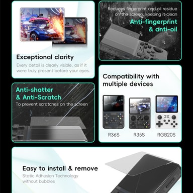 Kristallklart skydd: Skydda din R36S-skärm från repor och repor med dessa skärmskydd av högtransparens härdat glas. De ger ultimat klarhet samtidigt som den behåller den ursprungliga beröringskänsligheten på din enhet, vilket säkerställer en smidig och njutbar spelupplevelse.