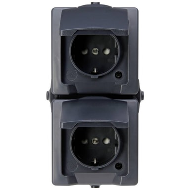 • Utanpåliggande montering för våtrum, 2-faldigt jordat uttag i design NAUTIC och färg antracit med fällbart lock och förhöjt beröringsskydd inkopplat