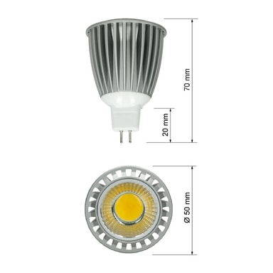Teknisk information: Modell: MR16 9W - varmvitt Uttag: MR16 Vinkel: 120 ° Strömförbrukning: 9W (9W LED motsvarar 60W halogen) Driftspänning: 12V DC Färgtemperatur: varmvit: 3200 - 3500 K Ljusstyrka: 9W - 740 Lumen Energieffektivitetsklass: A + Ljus Färg: Varmvitt Dimension (D x L): 50x56 mm Ljusreglering: Ej Dimbar