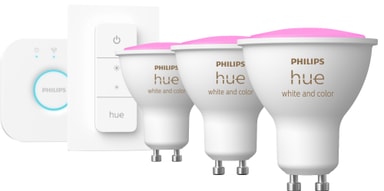 Startpaketet Philips Hue White and Color Ambiance 4.3W GU10 Bridge-kit innehåller 3 smarta glödlampor och Hue-bryggan som ger full kontroll över dina smarta lampor. Med 16 miljoner olika färger kan du prova olika nyanser av vit och färgrik belysning och skapa vilken stämning du vill. Festlig, avslappnande eller ljus, valet är ditt.