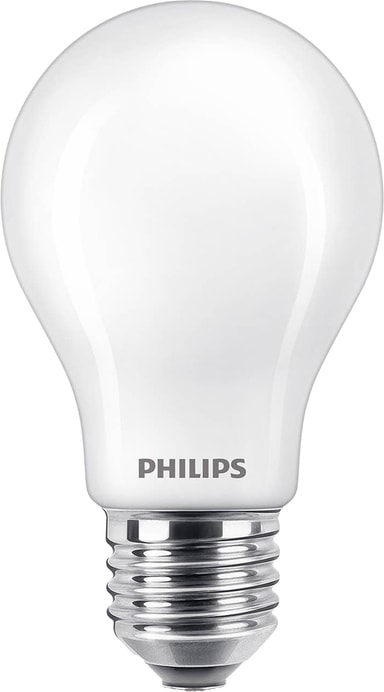 Philips Classic A60 5W E27 LED bulb emits warm white light through frosted glass, lasts up to 15,000 hours, lights up in 0.5 seconds with 470 lumens, ideal for indoor use and eye comfort.Läs mer om produkten