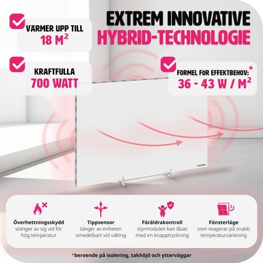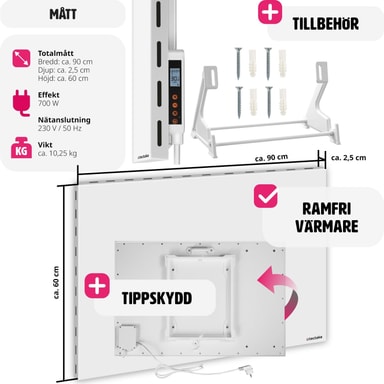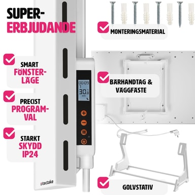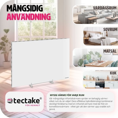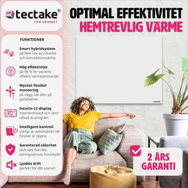 Få ut det bästa av uppvärmningen med denna moderna hybrid infravärmare med tippskydd från tectake. Få ny inspiration till mysiga stunder i ditt hem med denna terassvärmare. Förutom de olika inställningsmöjligheterna för olika tider på dygnet, så registrerar den innovativa radiatorn plötsliga temperaturfall och reagerar därefter. Den extremt platta konstruktionen på vår infravärmare, gör att den antingen kan placeras mobilt på golvet med hjälp av det medföljande stativet eller skruvas fast i väggen eller taket - upplev känslan av mild infravärme med denna kraftfulla hybrid infravärmare från tectake.