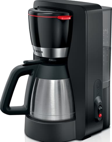 MyMoment är en stilfullt utformad kaffebryggare med ett svart hölje och en termoskanna i rostfritt stål. Den upplysta på/av-knappen och den röda dekorationslinjen kompletterar designen på ett perfekt sätt.