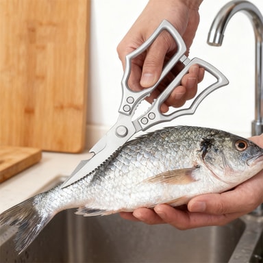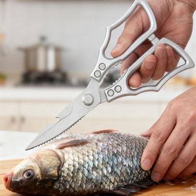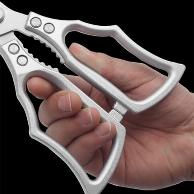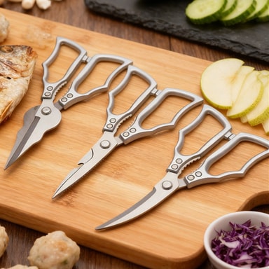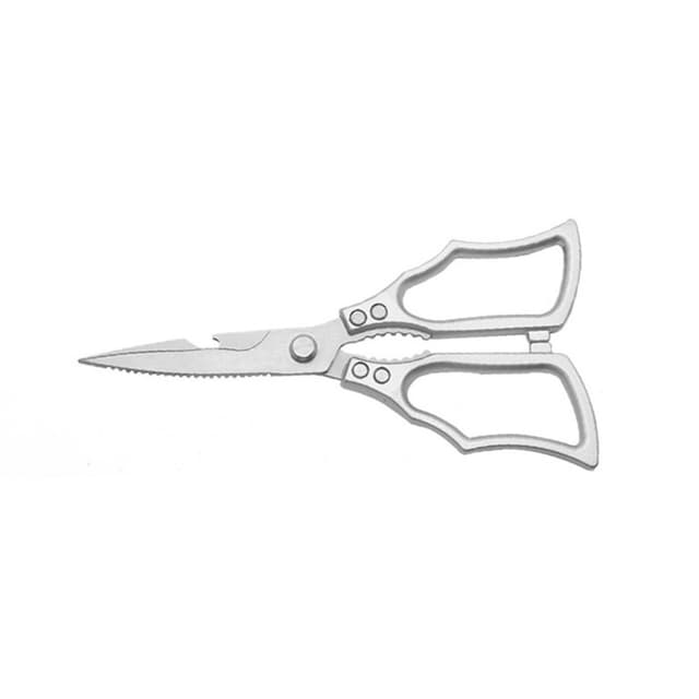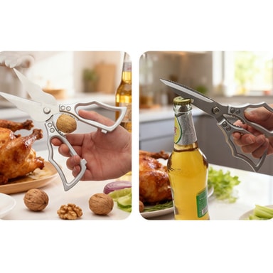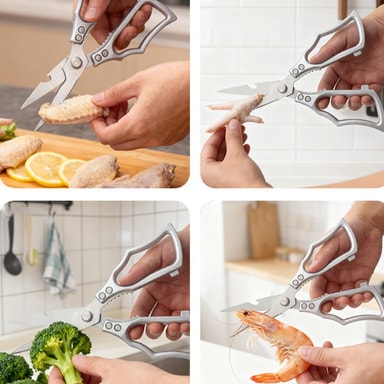 Mångsidigt köksredskap: Dessa multifunktionella köksaxar är designade för en mängd olika uppgifter. Från att skära fjäderfäben och kött till att filéa fisk och hacka grönsaker, dessa saxar är ett oumbärligt verktyg för alla kök. Det tandade bladet ger ett överlägset grepp, vilket gör det enkelt att skära igenom tuffa material. Köksaxen kan också användas för att skala fisk och trimma örter. Den ergonomiska designen säkerställer ett bekvämt grepp, även vid längre användning.