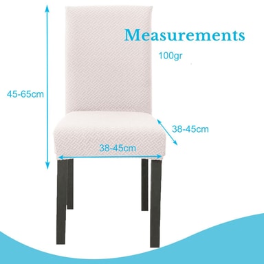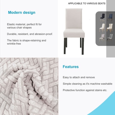 Det elastiska stolsöverdraget garanterar snabb sträckning och ett bra grepp, samtidigt som det får även gamla stolar att se ut som nya. Samtidigt skyddar den mot damm, fläckar, repor och blekning med tiden.