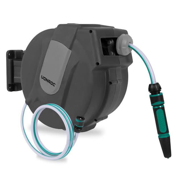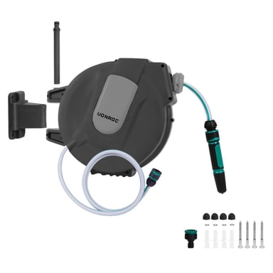 Det har aldrig varit enklare att vattna gräsmattan, vattna växterna, tvätta bilen eller fylla poolen. Den här väggmonterade slangvindan från VONROC fäst på väggen och kan vridas 180° efter fastsättningen, du kan alltså gå i alla riktningar och vattna vilken plats som helst i din trädgård enkelt och snabbt. Är du färdig med din bevattning? Slangen rullas upp automatiskt, vilket förhindrar smutsiga händer och en trasslig trädgårdsslang tack vare den integrerade slangguiden. Praktiskt, eller hur?
