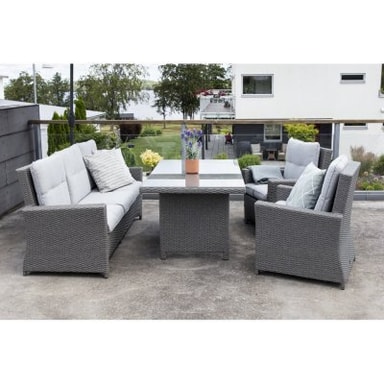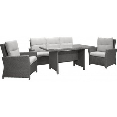 Komplett set med en elegant 3-sits soffa, 2 stycken fåtöljer i matchande design, samt ett bord - likaså i grå konstrotting - tillsammans med en toppskiva av glas.