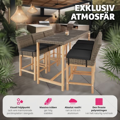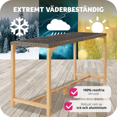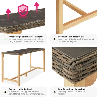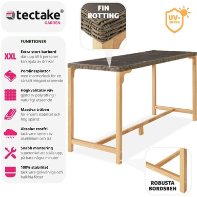 Detta anmärkningsvärda Lovas barbord i rotting från tectake kombinerar den varma charmen av äkta trä med den coola looken av marmor. Den stiliga looken kompletteras av det mycket naturliga rottingmönstret som omger det stora barbordet. Det attraktiva utseendet barbordet har kombineras med hög resistens mot smuts, bra stabilitet och hållbarhet. En liten men fin detalj är de runda plastkåporna under bordsbenen, som skyddar ditt golv från repor - stiligt och extremt praktiskt: det mångsidiga barbordet Lovas från tectake.
