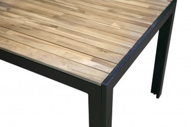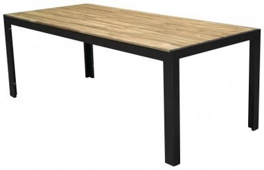 Ett robust bord med ett underrede av svartlackerat stål, som bär upp en toppskiva av karaktäristiskt vackert - och tåligt - akacia-trä.