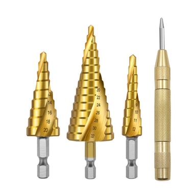 Förbättrad borrprecision: Den medföljande centerpunchen möjliggör exakt markering av borrplatser, vilket eliminerar risken för att borren glider eller vandrar. Detta är särskilt användbart när du arbetar med ömtåliga material eller när noggrannhet är av största vikt. Stegborrarna har tydligt markerade steg, vilket möjliggör enkel skapande av hål med varierande diametrar utan behov av flera borrar. Spiralspårdesignen bidrar ytterligare till borrprecisionen genom att effektivt avlägsna spån och minska värmeuppbyggnaden. Denna kombination av funktioner säkerställer rena, exakta hål varje gång, vilket gör detta set till ett viktigt verktyg för alla proffs eller gör-det-självare som värdesätter precision och effektivitet. Hex-skaftet ger ett säkert grepp i borrmaskinen, vilket förhindrar glidning och säkerställer optimal kraftöverföring. Kompatibel med borrmaskiner.