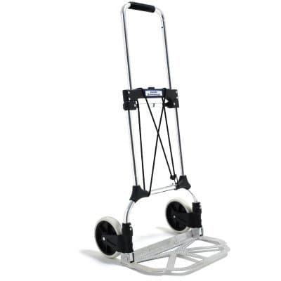 En mycket lätt och smidig bagagekärra i aluminium som tar minimal plats hopfälld. Greppvänligt mjukt handtag. Stora punkteringsfria hjul för bra framkomlighet. Hjulen är kullagrade vilket gör att den rullar lätt. Enkel mekanism gör att hjul och lastplan fälls in samtidigt.
