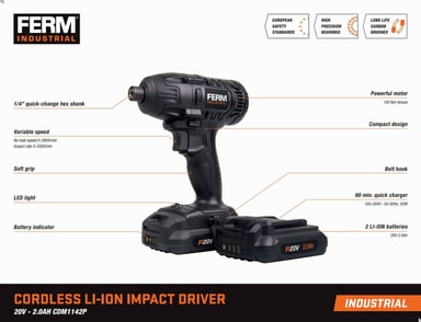 Denna slagborrmaskin är en del av FERM Industrial FI20V-plattformen, vilket innebär att batterierna och laddaren kan bytas ut med alla maskiner inom plattformen. Denna slagborrmaskin levereras i en robust förvaringsväska som innehåller två 2,0Ah Li-Ion-batterier, en snabbladdare och två skruvbits.