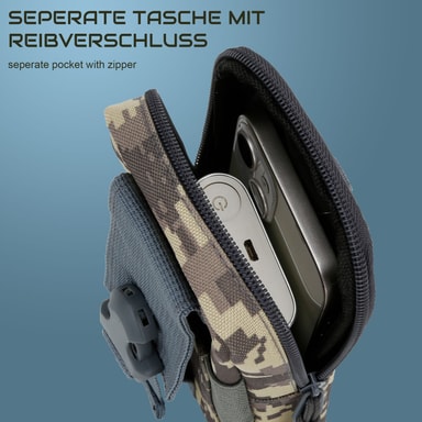 Molle-remmen på baksidan ger flexibla fästmöjligheter på ett bälte, en ryggsäck eller en väst. Den medföljande axelremmen erbjuder ytterligare ett bäralternativ. Denna mångsidighet gör väskan till en oumbärlig följeslagare.