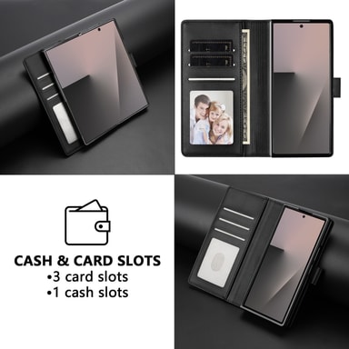 Detta eleganta fodral i klassiskt kalvtexturerat PU-läder kombinerar stil med funktionalitet. Med två kortfack, ett fotofack och en sidoplånbok för kontanter erbjuder det smart förvaring i ett kompakt format.Läs mer om produkten