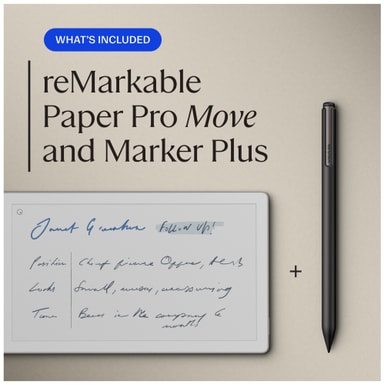reMarkable Paper Pro Move E-ink-surfplatta + Marker Plus-paket erbjuder en distraktionsfri, pappersliknande upplevelse, 15 dagars batteritid, konvertering från handstil till text och molnsynkronisering för bekvämlighet och produktivitet på språng.Läs mer om produkten