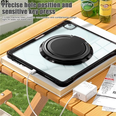 Detta robusta skal kombinerar funktionalitet och skydd med en 360° roterbar och 180° vikbar handrem, vilket gör det enkelt att bära, hänga eller använda din surfplatta i olika positioner. Tillverkat av PC, TPU och akrylmaterial, erbjuder det ett heltäckande skydd mot stötar, fall och vardagligt slitage. De förstärkta hörnen absorberar effektivt stötar vid olyckor. Det justerbara stödet ger stabilitet för handsfree-användning i olika vinklar. Den transparenta akrylryggen visar upp surfplattans design samtidigt som den skyddar effektivt.