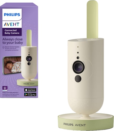 Philips Avent Connected Baby Camera låter dig övervaka din baby säkert från var som helst med hjälp av Baby Monitor+ appen. Den har en Full HD 1080p kamera med mörkerseende, tvåvägskommunikation för realtidssamtal och inbyggda lugnande ljud med nattlampa för bättre sömn. Secure Connect-systemet ger varningar för förlorad anslutning, temperaturförändringar, ljud och rörelsedetektering, medan bakgrundsövervakning håller dig ansluten även när du använder andra appar eller när din telefon är låst.
