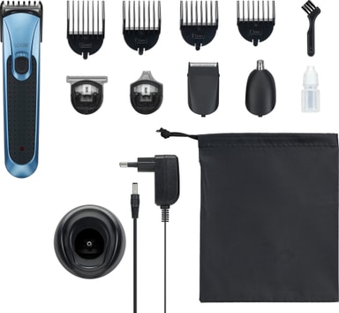 Med Logikhårklippare LMTHC20E kan du klippa och trimma både hår och skägg med hjälp av en enda maskin. Klipparen kommer med 3 avtagbara tillbehör och 7 olika längdinställningar så att du enkelt kan trimma skägg och hår precis som du önskar. Den har 45 minuters batteritid och kan användas på både torrt och fuktigt hår.