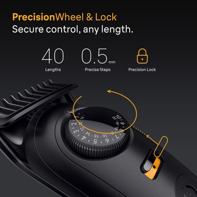 Trimmern har 40 längdinställningar, var och en exakt 0,5 mm från varandra. Använd precisionshjulet för att välja den bästa längden för dig.