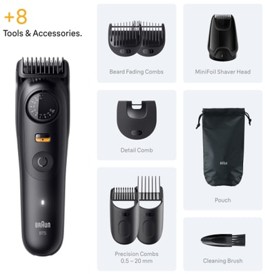 Braun Series 5 skäggtrimmer inkluderar fem kammar och ett tillbehör för exakt skötsel. En praktisk påse håller allt organiserat, medan rengöringsborsten säkerställer enkelt underhåll.