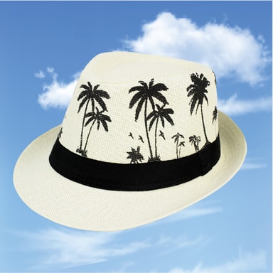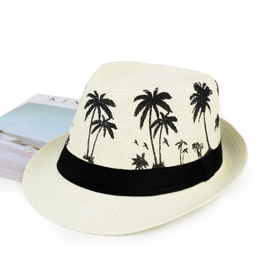 Trendig design: Gör ett uttalande med denna trendiga jazzhatt med kokospalm. Den benvita färgen och det unika kokospalmmönstret ger en touch av tropisk charm till vilken outfit som helst. Dess mångsidiga design kompletterar olika stilar, från avslappnade strandkläder till eleganta sommarplagg.