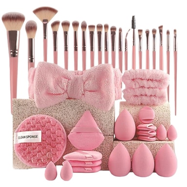 Komplett sminklösning: Detta 40-delars sminkborstset erbjuder en omfattande lösning för alla dina sminkapplikationsbehov. Det inkluderar en mängd olika borstar för foundation, ögonskugga, puder och mer, tillsammans med sminksvampar, handledsband, ett pannband och rengöringspuffar. Denna omfattande kollektion säkerställer att du har rätt verktyg för att skapa vilken look som helst, från naturlig vardagssmink till glamorösa kvällsstilar. Det varierande utbudet av borstar möjliggör exakt applicering och blandning, vilket förbättrar din övergripande sminkfinish och ger en professionell touch till din skönhetsrutin. Perfekt för både nybörjare och erfarna sminkentusiaster, detta set erbjuder exceptionellt värde och mångsidighet.