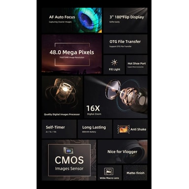 Exceptionell bildkvalitet: Fånga fantastiskt klara och detaljerade foton med den uppgraderade 48MP-sensorn i denna digitalkamera. Upplev livfulla färger och skarpa detaljer som ger dina minnen liv med exceptionell bildkvalitet. Perfekt för att fånga landskap, porträtt och vardagliga ögonblick med otrolig klarhet. Den högupplösta sensorn säkerställer att dina foton ser fantastiska ut oavsett om du tittar på dem på en stor skärm eller skriver ut dem. Denna kamera är utformad för att leverera resultat av professionell kvalitet i ett kompakt och användarvänligt paket, vilket gör den idealisk för både amatörer och erfarna fotografer.