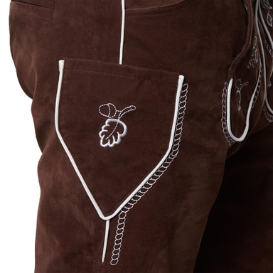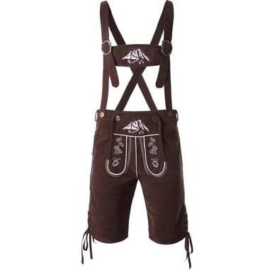 Dessa lederhosen kombinerar rustik charm med traditionell elegans och ger din traditionella oktoberfestoutfit en elegant touch. Med sitt klassiska traditionella utseende och fina vita broderier är de den perfekta följeslagaren för oktoberfest, maskerader och temafester. Oavsett om de kombineras med en traditionell blus eller en skjorta så kommer dessa ""läderbyxor"" alltid att göra din outfit till festens mittpunkt.