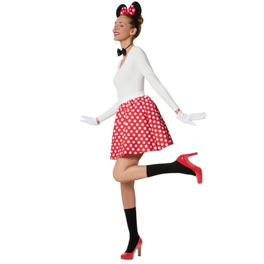 Sprid magisk charm med damkostymen Damen Maus! Denna förtrollande dräkt tar den populära karaktären direkt till nästa maskerad- eller temafest. Setet består av en röd kjol med vita prickar, ett hårband med musöron och rosett, en matchande fluga och vita handskar – allt du behöver för en perfekt entré.