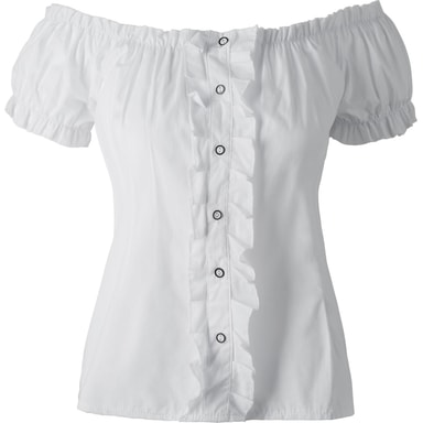 Med Tracht-blusen Gerti är det tydligt varför axellösa blusar är så populära. Ryschdetaljerna framhäver den generösa halsringningen och gummiresåren ger en perfekt passform. Även de korta ärmarna har ryschdetaljer och gummiresår. Knappslån har försetts med ryschkanter på båda sidor. Blickfång bak är den vackra snörningen i korsryggen, vilket ger en snygg midja på blusen. Tyget av ren bomull garanterar hög bärkomfort, Material: 100 % bomull.