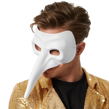 Denna venetianska mask med lång näsa har verkligen ett imponerande utseende. Den här enfärgade accessoarens kännetecken är naturligtvis den långa och lätt nedåtböjda näsan, som bokstavligen sticker ut. Med de två smala satinbanden kan den bekväma halvmasken anpassas till varje huvudstorlek, Material: plast, polyester.