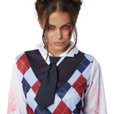 Damdräkten Kuslig skolflicka består av en slipover-liknande överdel med rutigt mönster. De påsydda skjortdelarna är fransiga på ändarna och med blodstänk. Den tillhörande kjolen med resår har påsydda ränder i två rader på fållen och är även den fransig. För en speciell look innehåller dräkten en kravatt med resår som kan hängas runt halsen samt knästrumpor med blodstänk, material 100 % polyester.