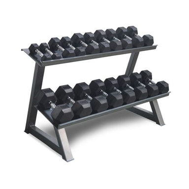 Specifikationer: Längd: 1350 mm Djup: 754 mm Höjd: 764 mm Djup över hyllan: 300 mm Djup nedre hyllan: 345 mm Stället är anpassat för följande hantlar: 2x2, 2x4, 2x6, 2x8, 2x10, 2x12,5, 2x15, 2x17,5, 2x20 KG