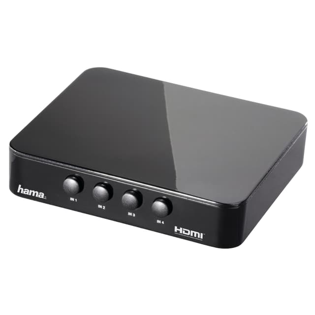 Med HDMI-omkopplingskonsol Hama G-410 är det möjligt för dig att byta upp till fyra digitala video- och ljudsignaler på AV-enheter, för att ansluta en Blu-ray-spelare, HD-mottagare, bärbar dator eller spelkonsol med TV. Du behöver varken ta ur eller sätta in pluggar. Omkopplaren är HDCP-kompatibel.