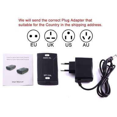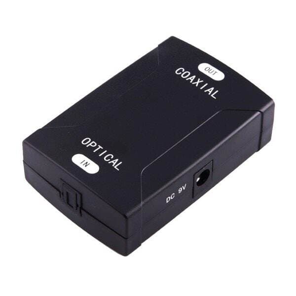 Digital Audio Signal Converter-enhet konverterar optisk TosLink-kontakt (IN) till koaxial RCA-kontakt (OUT). Denna konverterare omvandlar din Digital Toslink Optical-signal till en digital RCA-koaxial (S / PDIF) ljudsignal.