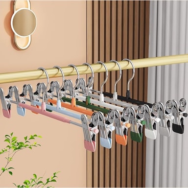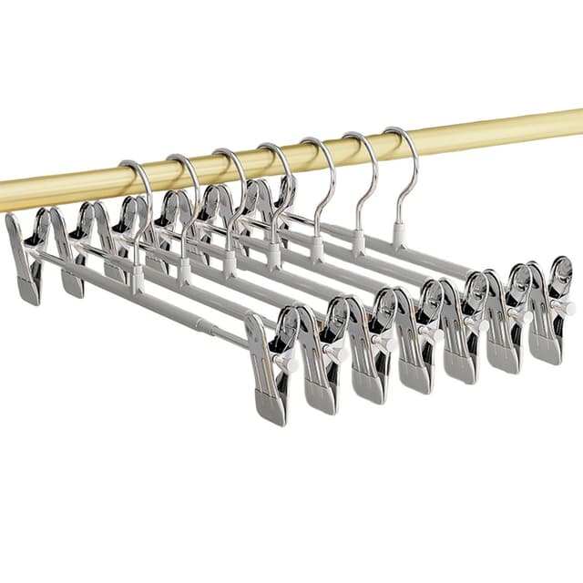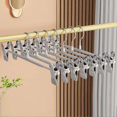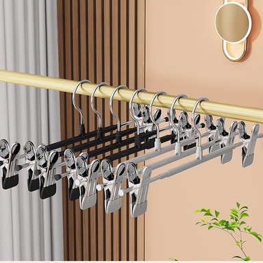 Justerbara, skadefria clips: Med justerbara clips rymmer dessa hängare olika storlekar och stilar av kläder. Clipsen är designade med ett mjukt grepp för att förhindra märken eller skador på dina plagg. Den justerbara funktionen gör att du kan anpassa hängaren för att passa dina specifika behov, vilket gör den perfekt för allt från barnkläder till föremål i vuxenstorlek. Clipsen glider smidigt längs hängaren, vilket ger enkel justering och förhindrar att dina kläder fastnar eller rivs. Dessa hängare är idealiska för att organisera din garderob och hålla dina kläder i toppskick. Det mjuka greppet säkerställer att även ömtåliga tyger skyddas från skador.