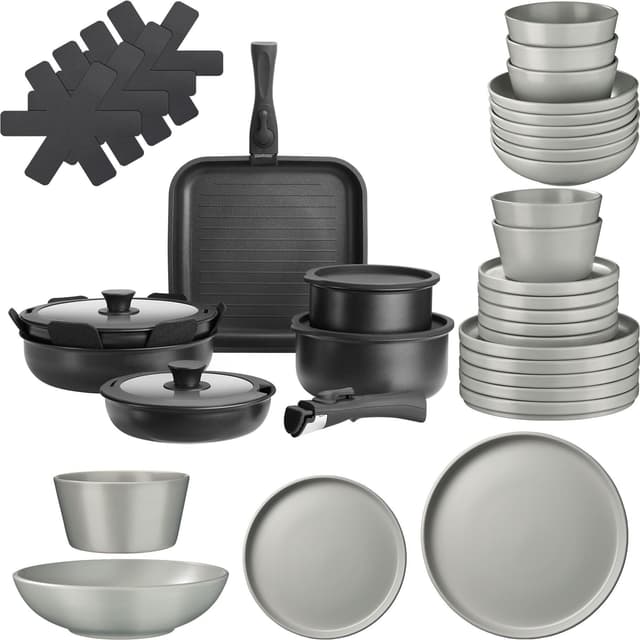 tectake Köksstartpaket med 6 kuvert inkl. porslin, kastruller m.m. 45.5 x 26 x 4.8 cm Grå/Svart