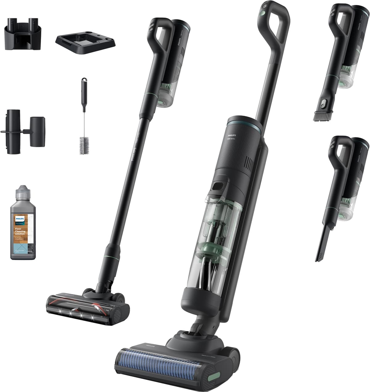 Philips 7000-seriens AquaTrio XB9154/09 handdammsugare har 3 lägen: Dammsug & Tvätta, Dammsugning, och Handhållet. Sladdlös med AquaSpin-borstar som snurrar i 2500 rpm för effektiv rengöring i ett drag.Läs mer om produkten
