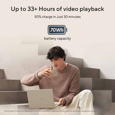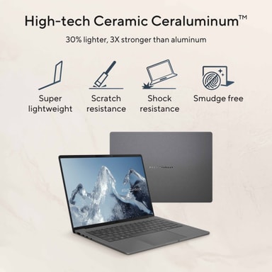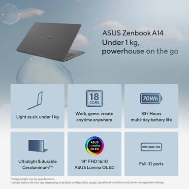Tillverkad med ett ceraluminum-chassi är Zenbook A14 både lätt och hållbar, väger endast 0,99kg och mäter bara 1,34cm i höjd. Den är designad för mobilitet, med ett batteri som håller upp till 33 timmar och stöder snabbladdning.