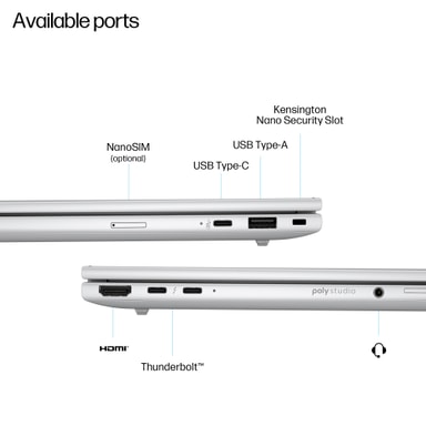 HP Wolf Security ger konstant skydd på hårdvarunivå. Den bärbara datorn inkluderar en fingeravtrycksläsare och ansiktsigenkänning via IR-kameran för säker biometrisk autentisering. Trusted Platform Module (TPM) 2.0 erbjuder datakryptering, medan multifaktorautentisering lägger till ett extra lager av säkerhet. Kabellåsuttaget möjliggör fysisk säkerhet i delade utrymmen.